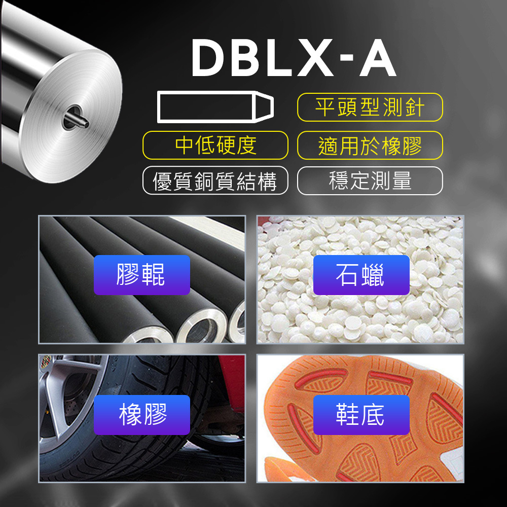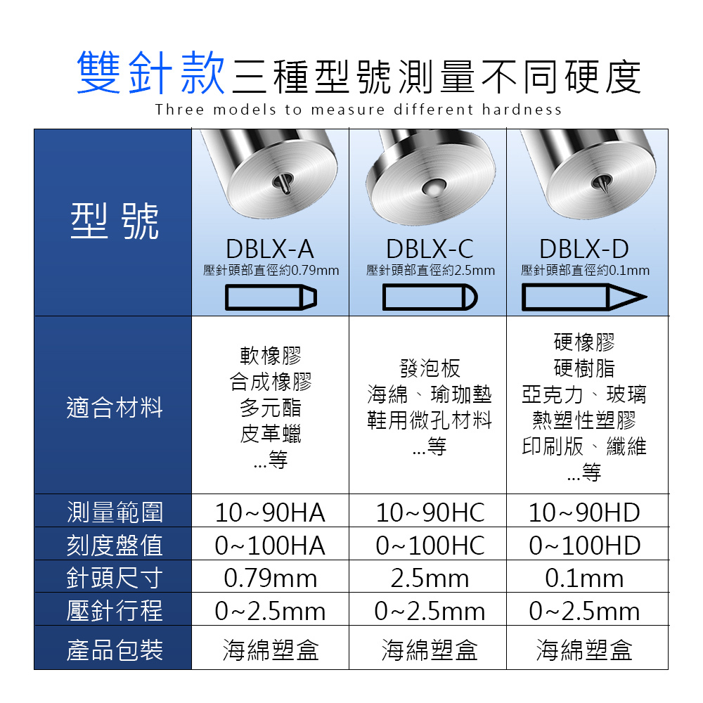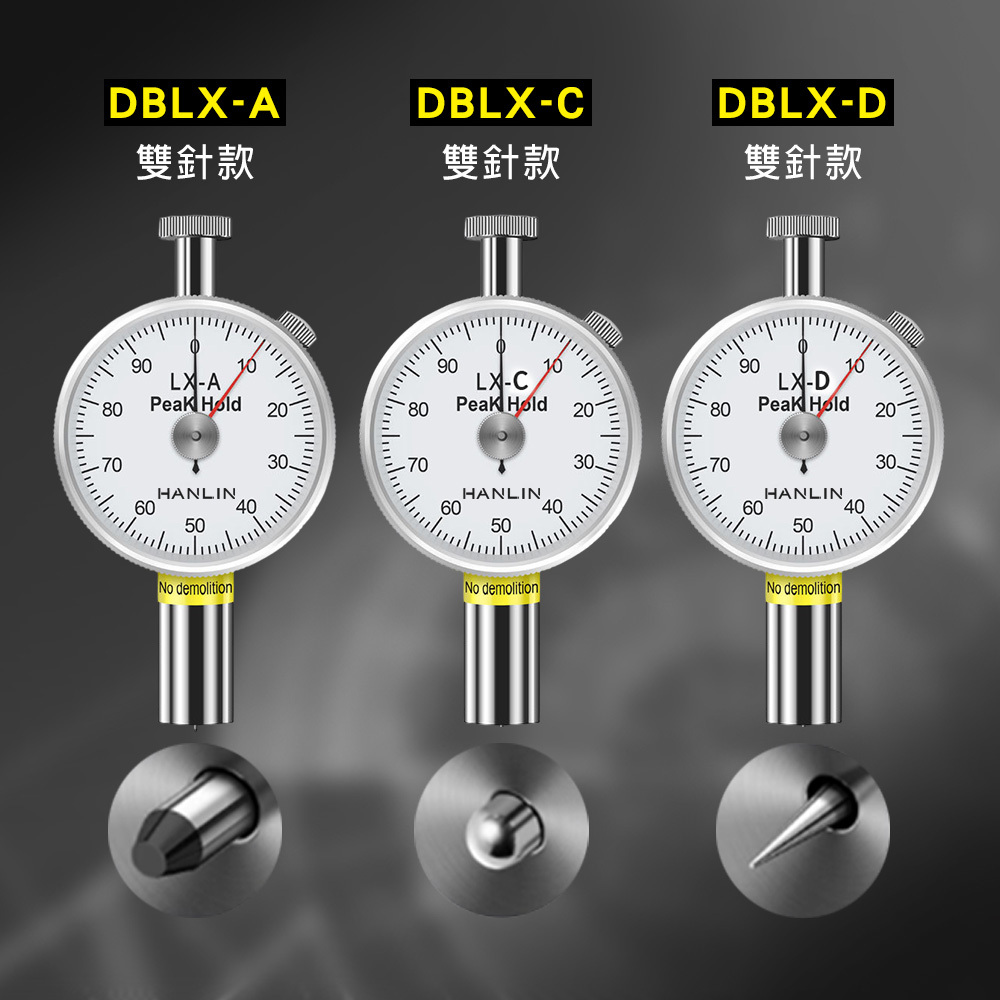 HANLIN DBLX-ACD 雙針款 邵氏硬度測試計 指針 硬度 測量儀 DBLX-A型 平頭 DBLX-C型 圓頭 DBLX-D型 尖頭 合金探頭 刻度錶盤 高彈性壓簧 高精度 測試 易操作 石蠟 鞋底 橡膠 海綿 發泡板 瑜珈墊 壓克力 玻璃 塑膠