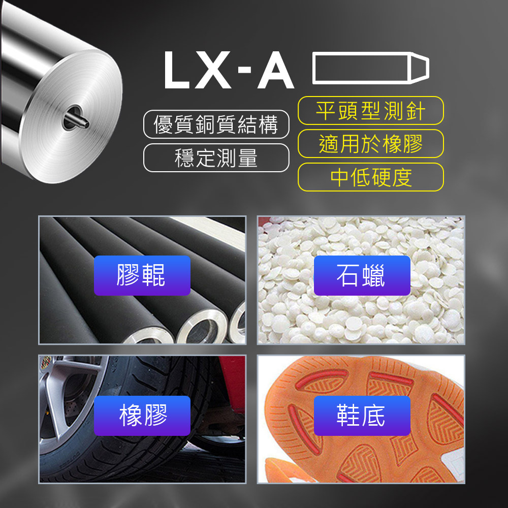 ●硬度計適用範圍:橡膠、合成橡膠、軟橡膠、聚酯、皮革、蠟......等